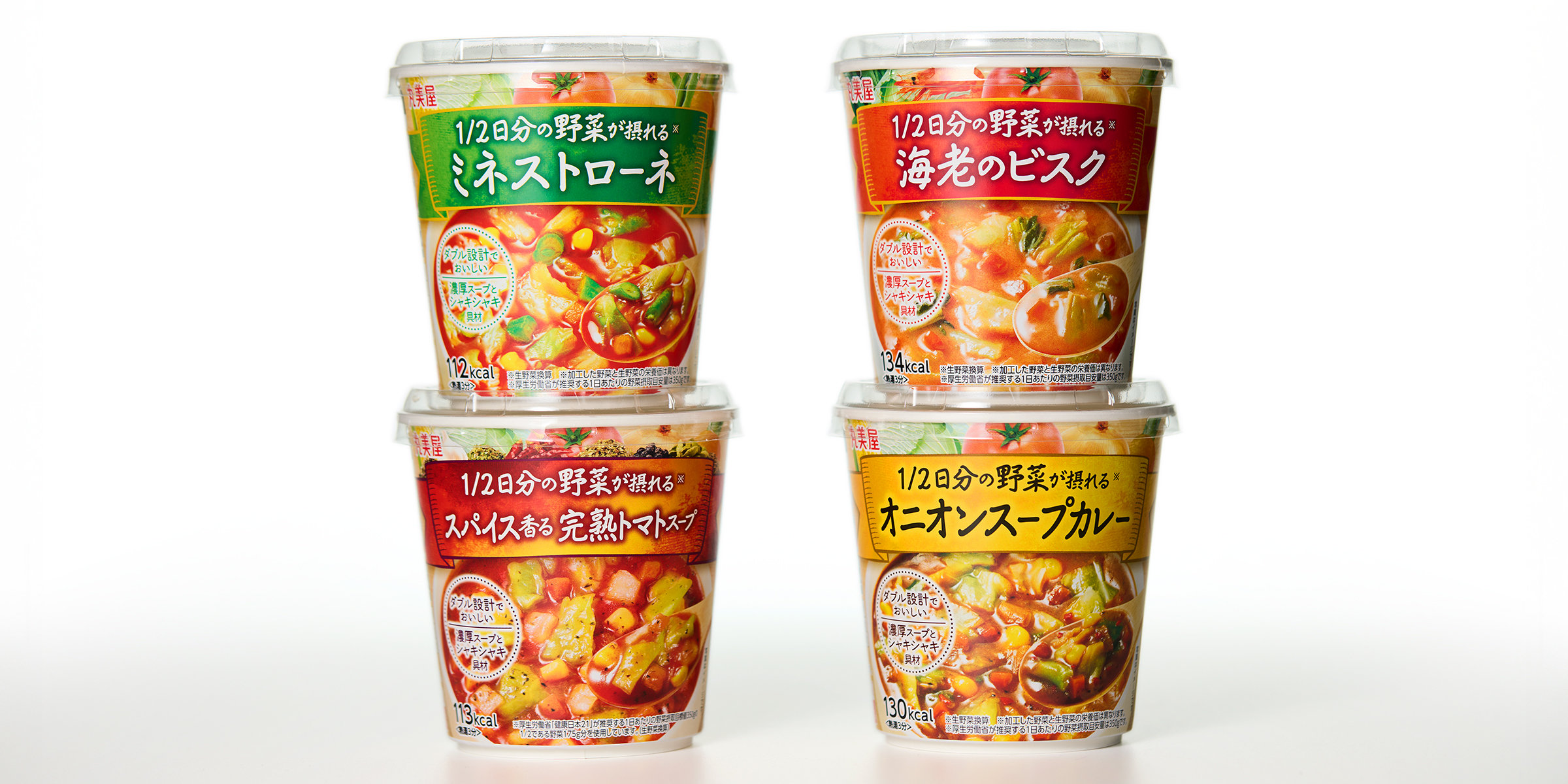 コンビニエンスストア等で販売されるカップスープのデザイン。それぞれのブランド全体で統一感が感じられるデザインに。