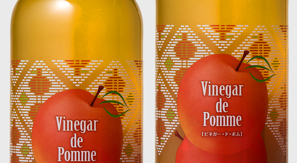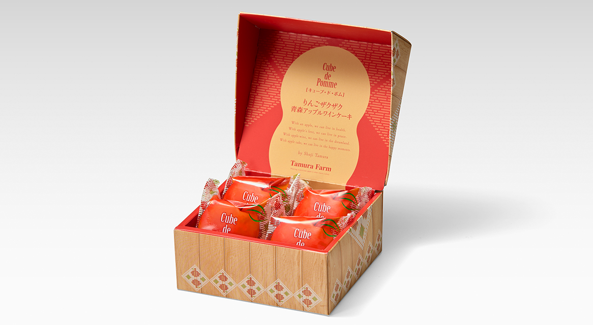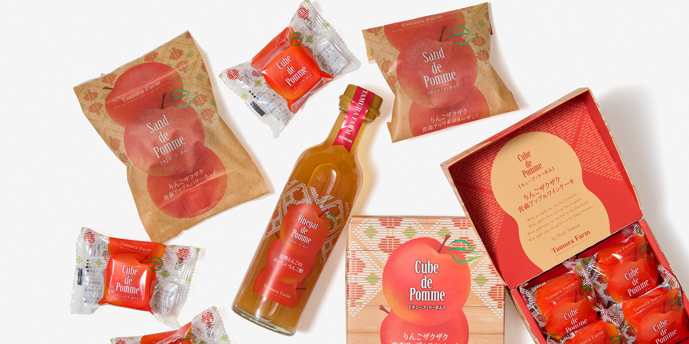 ブランドとしての統一感を持たせつつ、個包装や外装箱、ガラスびんなどさまざまな包装特徴を生かしたデザインを作成。特徴的なりんごモチーフは視認性も高く、ギフト用途としての華やかさも演出している。